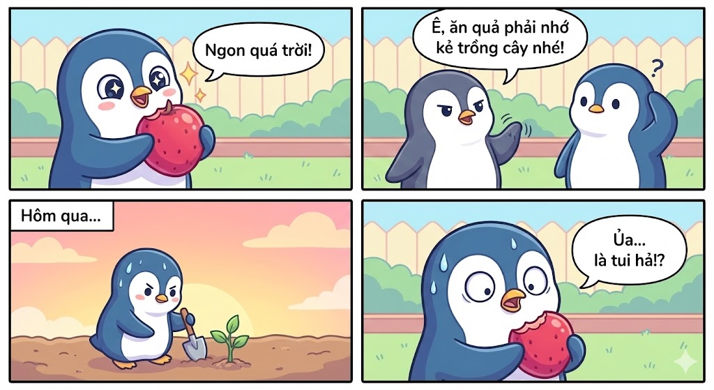 Truyện tranh 4: cánh cụt ăn quả luôn nhớ kẻ trồng cây
